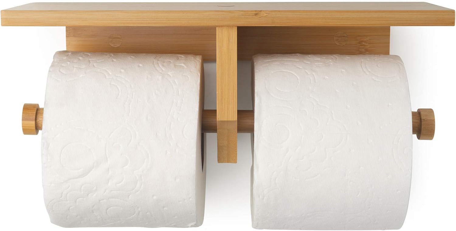 MULTIPLE ROLL TOILET PAPER HOLDER: This mounted holder can be loaded with 2 extra mega rolls at once, so you can worry less about running out at the worst times. You can even bulk stack multiple rolls on the wooden-like storage tray above the loading pegs