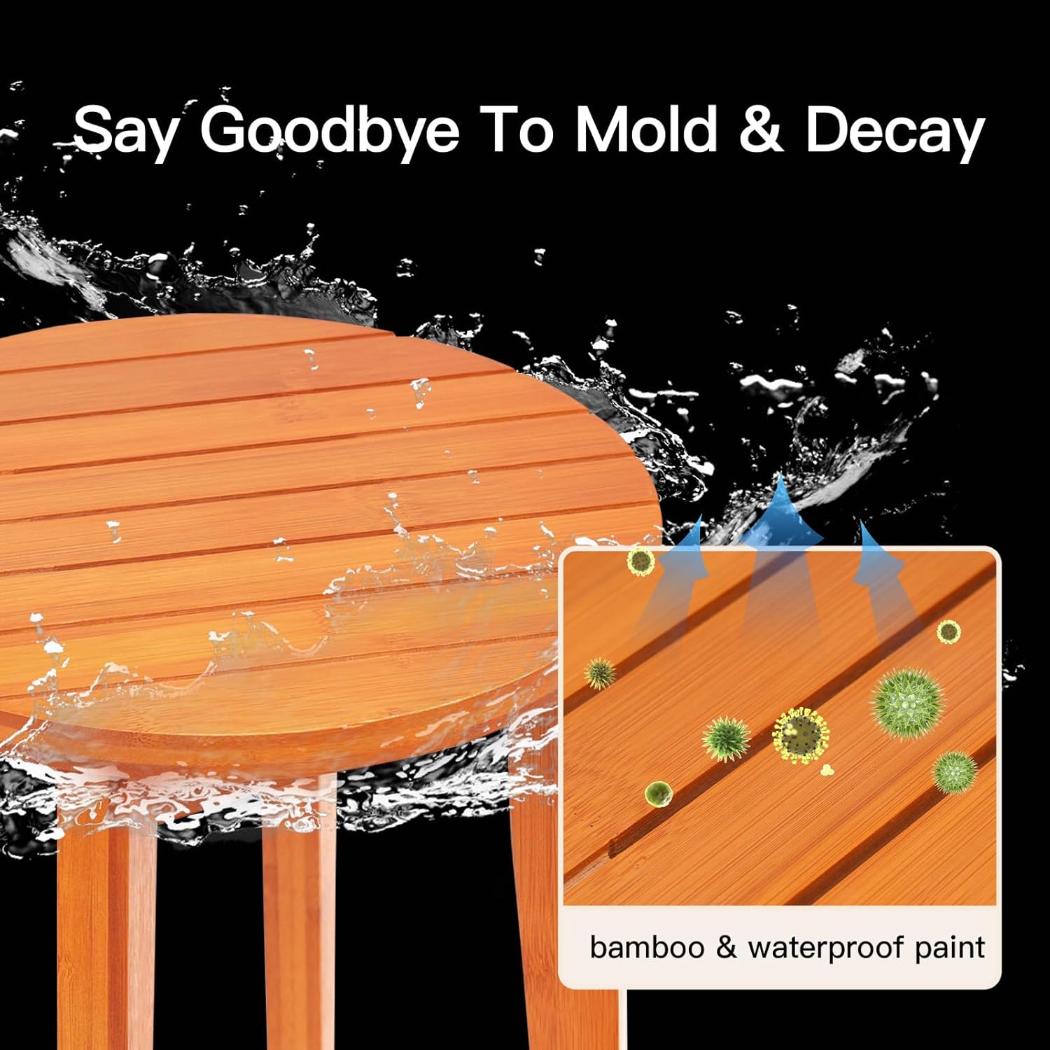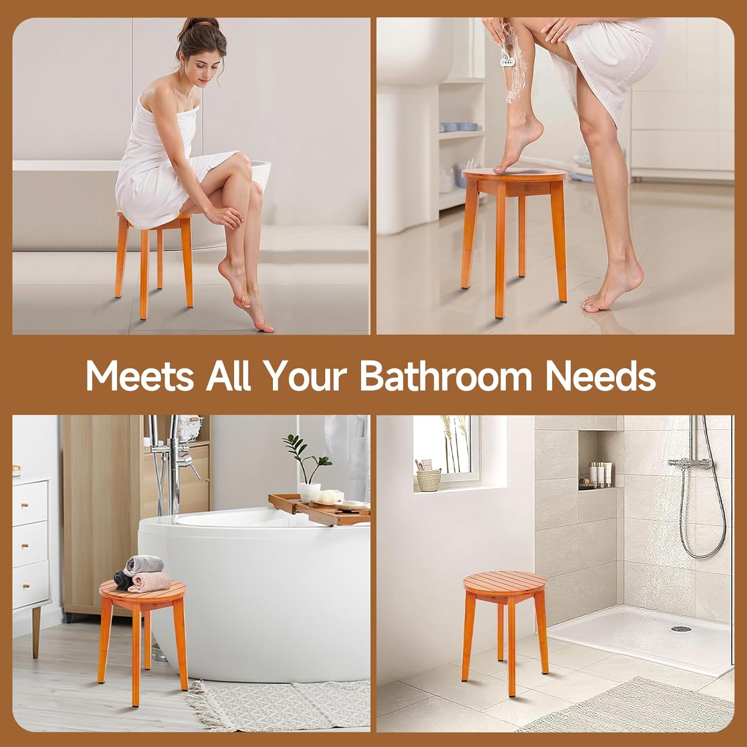 [Stable & Durable Design] Crafted from 100% natural bamboo with reinforced hex screws and double-bolt structure, this 16" round shower stool ensures long-lasting stability. Non-slip rubber feet provide extra grip on wet bathroom floors.