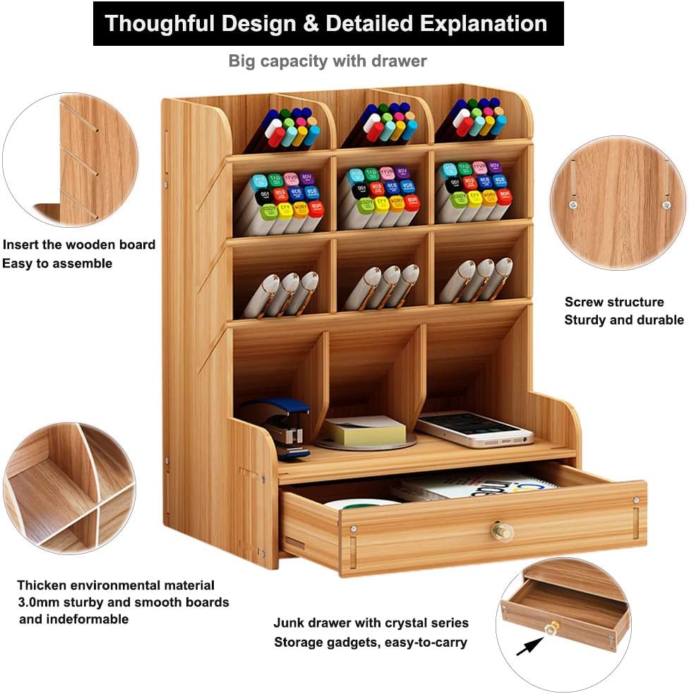 Wooden Desk Organizer with Drawer DIY Assembly Multi Functional Pen Holder Storage Rack 9 Compartments Office Home School Supplies China Products Manufacturer